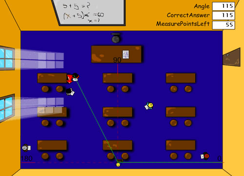 The object of Anti-Homework Elementary is to use your knowledge of angles and angle measures to make it through the week without having to take home any homework from homework-happy teachers. In the game, each day of the week is a different stage and each stage is a different classroom with homework-happy teachers positioned at various angles. Estimate the angle that the teacher with the flashing arrow is positioned at. Type the estimation in where it reads "angle" and then press "enter." Use the 0, 90, and 180 degree markers as a guide for estimating the angle measure. If your estimate is good, you will get to throw an anti-homework grenade, which will obliterate the stack of homework the teacher is intending to give you. Don't worry, the teacher is never harmed. There are five homework-carrying teachers in every round. Be careful though, as you progress through the week, your estimates have to get more precise. In each round, you only have a specific error allotment that ranges from 60 degrees on Monday, to only 25 degrees on Friday! For example, if you guess 100 degrees, and the actual measure location of the teacher is 120 degrees, you will lose 20 degrees from your error allotment. In addition, after each grenade launch, you can see how close your estimated angle was to actual angle. |