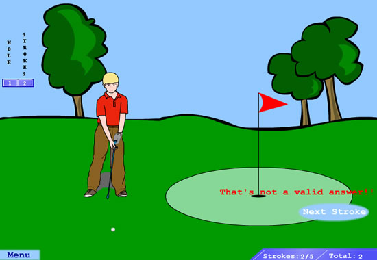 Step 3.) Click "validate" or hit the enter button on your keyboard. If your answer to the math problem is close (within 25 % of the actual answer), you will go on to the next shot, where the math problem will be easier. If your shot is not within 25 % of the actual answer, or you do not get it off in time, you must re-take the shot and lose a stroke. If you get the answer exactly right the first time, you get a hole in one. If you get it exactly right in the second or third shot, you sink the shot in the hole! The game is scored just like real golf. The goal is to get the LOWEST score possible.