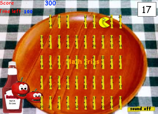 In Math Fries, find the number in the upper right corner. In the above example it is 17. Control your character by moving it with the mouse. Click on all of the fries that have a math problem that equals the number in the upper right corner. There will be 25 in each round that equal the number, and 25 that do not. If you click on three of the wrong fries, or run out of time, the game ends. Each new rounds gets a little bit harder.