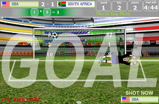 Step 3.) When you play the game, check to see if you are kicking first or on defense first (bottom left corner). Figure out the answer to the math problem and click the corresponding region of the goal that contains the answer.
