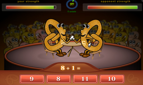 Are you up to this addition and subtraction challenge? Welcome to the first annual all-pretzel arm wrestling tournament. Although you can't hope to match the pure strength of the world's best arm wrestling pretzels, you have one advantage - The strength of your pretzel-flexible arms is governed by your quick skills in addition and subtraction. Subdue your worthy opponents with your error-free calculations. Be careful though - errors you can afford to make in the first few rounds will lead to your demise in the last few rounds. Be quick ---- and accurate. The calculations get harder as you move on, but you'll have to make less of them in the later rounds.